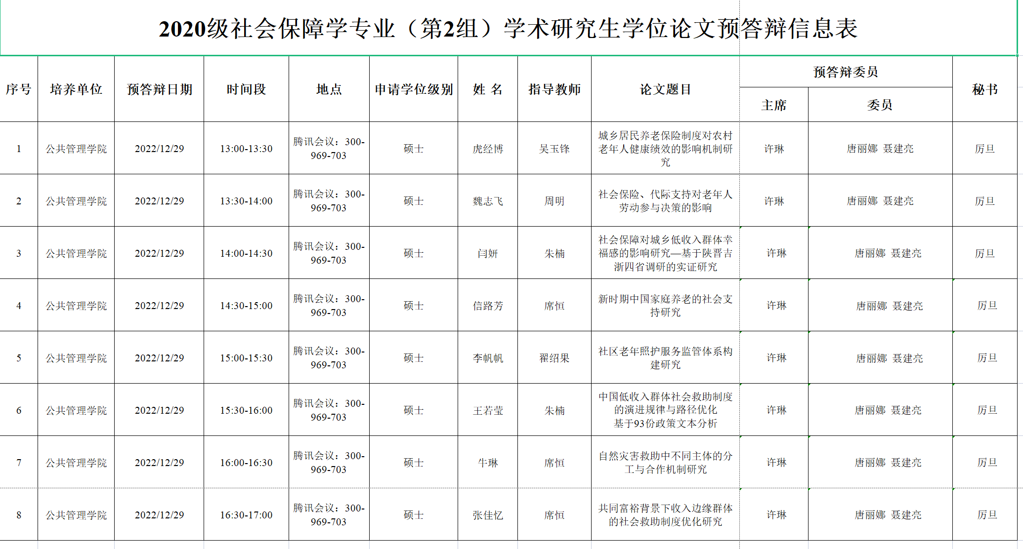 2020级社会保障学专业(第2组)学术研究生学位论文预答辩信息表