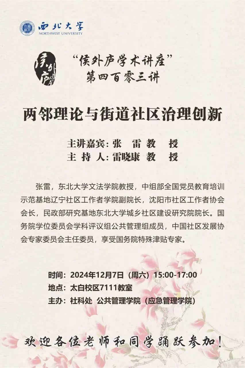 会议预告 | “侯外庐学术讲座” 第四百零三讲 两邻理论与街道社区治理创新