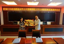 我院学生代表安翰韬在表态发言中,谈到通过查阅相关资料,了解到新城民政局是全国、省、市民政的一面旗帜,本次西大公管院一行10名同学能来新城区民政局实习,大家倍感光荣。作为90后大学生,在本次实习全过程,将自觉服从领导、扎实工作、遵守纪律,用辛勤的劳动和汗水,实实在在的增长见识和能力, 塑造当代大学生的良好风貌。