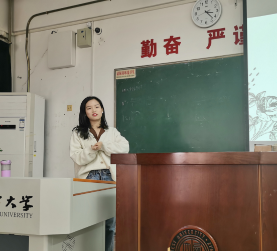第五位是来自图书馆学专业的彭导琦,她建议我们找到长处,在创新创业项目中主动当主持人,找到合适的指导老师。她也分享了一些出境交流的经验,出境交流可以获得更多新鲜的内容、拓展自己的思维。彭导琦同学还推荐大家积极参加外研社杯、全国大学生英语竞赛(NECCS)等英语竞赛,还有参加雅思、托福考试,鼓励大家摸索适合自己的背单词的方法。最后她建议大家“有的时候还是要逼自己一把,激发潜力,快乐是偶尔的,努力帮助我们赢得更多的选择权”。