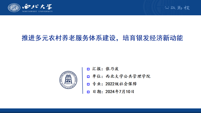 张乃波同学汇报的主题是《推进多元化农村养老服务体系建设,培育银发经济新动能》。首先介绍了推进多元化农村养老服务体系建设培育银发经济新动能的可能空间。包括三个方面。第一,保基本-多元农村养老服务体系建设能够促进文化经济基本目标的实现。第二,育产业-多元农村养老服务体系建设,培育银发经济发展核心动力。第三,优环境-多元农村养老服务体系建设,助力银发经济持续健康发展。其次,总结了农村多元化养老服务体系建设助力银发经济发展的成就与挑战。我国的农村多元养老服务体系建设日益完善,助力银发经济持续向好发展。与此同时,面临的挑战有高品质养老服务需求不断增长、专业型养老服务人才日益紧缺、数字化养老服务技术不断革新和适老化数字包容治理亟需完善。最后介绍了推进多元化农村养老服务体系建设,培育银发经济新动能的可为路径。第一,政策引导与法律规制并举,营造银发经济发展的制度环境。第二,事业情怀与产业思维并重,完善银发经济发展的产业链条。第三,技术赋能与要素保障并进,推动银发经济创新发展新路径。