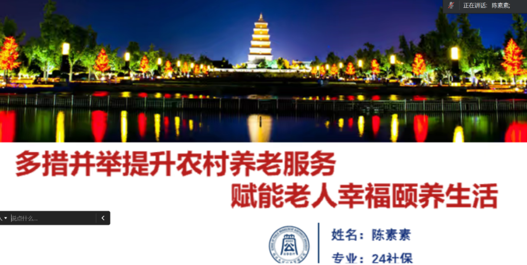 陈素素同学汇报的题目是《多措并举提升农村养老服务 赋能老人幸福颐养生活》,汇报主要从以下三个方面展开,分别是我国农村养老服务发展历程、农村养老服务顶层设计透视、农村养老服务实践路径研究。汇报层层递进,内容充分。