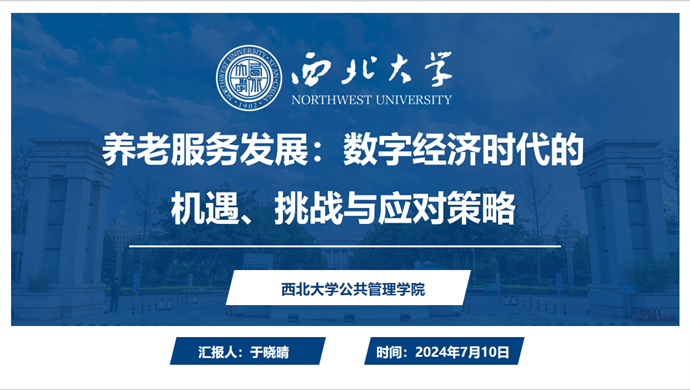 于晓晴同学汇报的题目是《养老服务发展:数字经济时代的机遇、挑战与应对策略》。首先,介绍了数字经济时代的特征。包括数据驱动,智能化升级,跨界融合和平台化运营四个方面。其次,介绍了数字经济时代养老服务发展的机遇,从三个层面进行了论述。第一,在宏观层面机遇,包括政策体系的全面升级为养老服务的发展提供了强有力的支撑、财政资金的倾斜支持是养老服务发展的重要保障、老年群体的消费升级为养老服务市场带来了前所未有的机遇以及国际合作拓宽养老服务发展的国际视野。第二,在中观层面机遇,如技术创新引领智能化、模式变革推动个性化、产业融合促进多元化。第三,在微观层面机遇,如通过服务升级提升养老服务品质、通过体验优化增强老年人幸福感、通过人才培养方式的变革保障养老服务可持续发展。其次介绍了数字经济时代养老服务面临的挑战,包括以下几个方面。第一,人才队伍建设:专业素质不足与人才流失的双重困境。第二,财务可持续性:投入不足与回报周期长的矛盾。第三,物资保障与管理:更新换代与质量控制的更高要求。第四,技术应用与创新:技术普及与数字化鸿沟的挑战。第五,管理优化与创新:精细化管理与数据安全及隐私保护。第六,地区差距:养老服务城乡发展不平衡愈加明显。最后提出了数字经济时代养老服务发展策略。第一,数字赋能:优化配置养老服务人力资源。第二,财务可持续性:构建多元化,可持续的投融资体系。第三,物资保障与管理:实现智能化,精细化的物资管理体系。第四,技术应用与创新:推动科技与养老服务的深度融合。第五,管理优化与创新:实现精细化,人性化的服务管理。第六,着力农村地区:利用数字经济特点促进城乡养老服务均衡发展。
