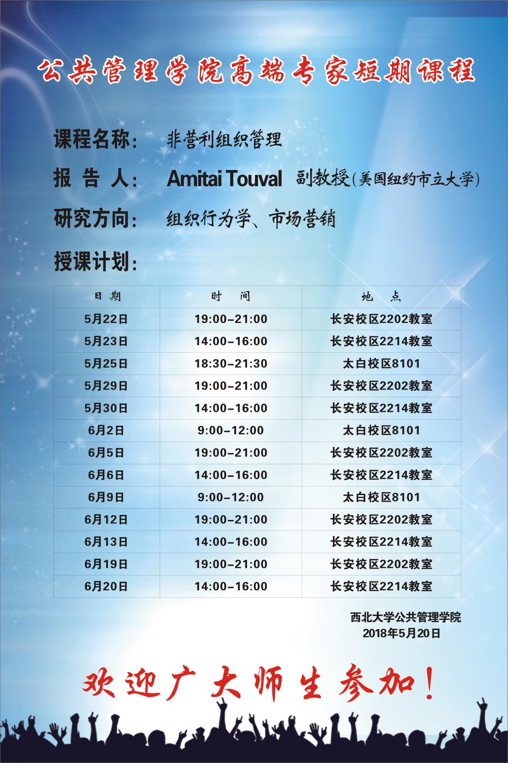 我院于2018年5月至6月期间,聘请美国纽约市立大学Amitai Touval教授为我院学术研究生和MPA在职研究生开设“非营利组织管理”课程。该门课程的详细授课时间和地点,请查阅学院公告栏,欢迎广大师生旁听。Amitai Touval博士是纽约市立大学Zicklin商学院教授,其主讲课程包括MPA项目的《非营利组织营销》和《组织行为学》课程,曾作为该校教师执教于台湾和新加坡,有比较丰富的教学经验。Amitai Touval博士曾在包括哈佛大学、麻省理工学院等教育部门领域工作,同时服务于ITAP等多个公司,有较强的实践经验。