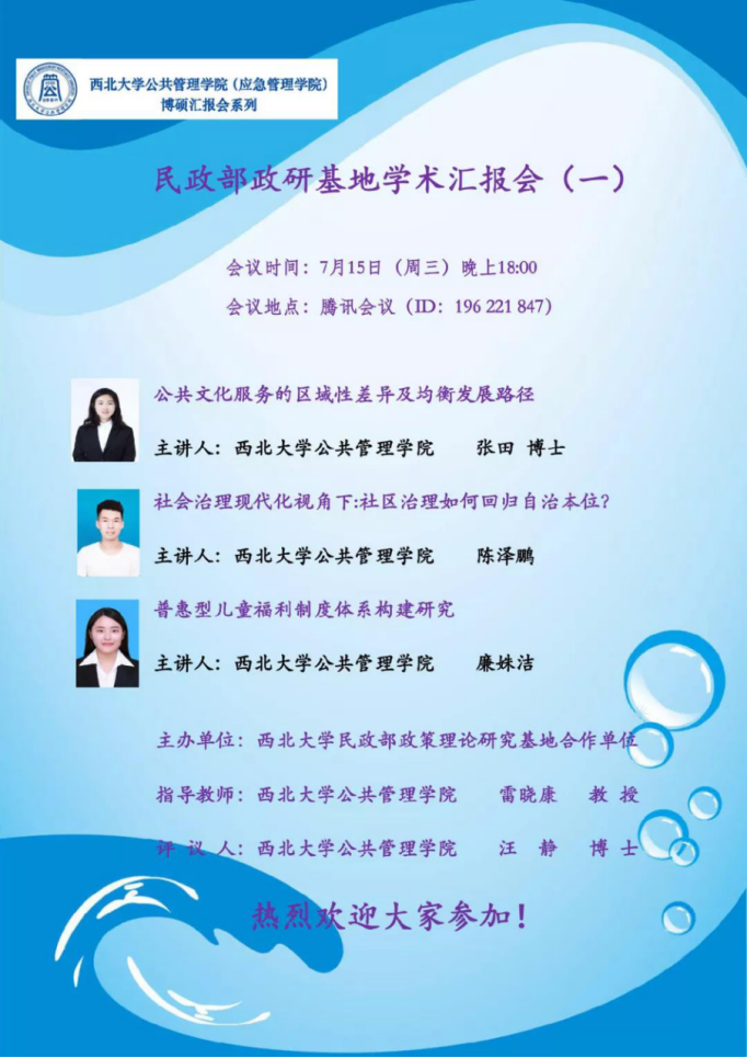 7月15日,我院举办第一期“博硕汇报会”——“民政部政研基地学术汇报会”。会议中,我院2019级公共管理专业博士生张田分享了《公共文化服务的区域性差异及均衡发展路径》的成果,该研究构建了公共文化服务均等化评估指标体系,采用均等化系数、基尼系数衡量我国各省的公共文化服务均等化程度,研究发现区域性差异体现在公共文化资源配置非均衡、公共文化服务事业费投入不均衡等方面。2019级行政管理专业硕士生陈泽鹏汇报主题为“社会治理现代化视角下社区如何回归自治本位?——基于西安市莲湖区民政部全国社区治理与服务创新实验区项目”。汇报指出从社会治理现代化“四化”发展要求来看,我国社区治理的社会化、法治化、智能化、专业化程度不高,导致社区难守自治本位。在这样的背景下,西安市莲湖区通过“三个清单+一个办法”助推社区减负增效。最后,从社会组织培育、法律法规健全、信息平台建设和社工队伍建设四方面提出了社会回归自治本位的对策建议。2018级社会保障专业硕士生廉姝洁的汇报题目是《普惠型儿童福利制度体系构建研究》。汇报依次从研究背景、研究基础、普惠型儿童福利制度体系的理论构想、我国儿童福利制度体系的现状分析、普惠型儿童福利制度体系的普惠路径、研究计划这六个模块展开。汇报分享了以政策要件、对象要件、福利要件作为三个主要维度的普惠型儿童福利制度体系的三维模型,并结合当前我国儿童福利制度体系建设现状,研究提出了由政府主导的替代圈、社会力量集中的补充圈、家庭主力支撑的支持圈组成的儿童福利普惠路径。