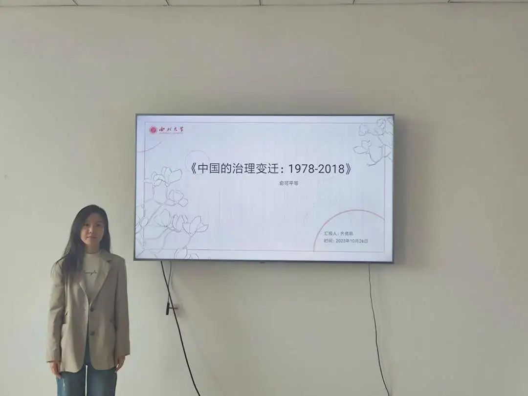 2022级行政管理专业硕士研究生齐倩茹分享的书籍为著名学者俞可平所编写的《中国的治理变迁》,她从书目与作者简介、逻辑思路与框架、个人收获与总结三个方面展开分享。首先,她从两方面阐述了作者在本书中所传达的思想。她讲解到,一方面是总论,从改革开放以来我国治理与改革的基本含义、中国治理模式特征以及如何推进国家治理现代化来进行论述;另一方面为分论,分论从不同层面详细地阐述了我国改革开放以来治理与改革的内容。并且,她强调本书以党的建设、根本制度、协商民主、基层民主、行政改革、政府责任、政治监督、公共政策、公共服务、社会治理等十个重要政治领域的改革为例,系统地论述了改革开放40年来中国在党的建设、国家治理、社会治理和基层治理等方面的变化与进步。