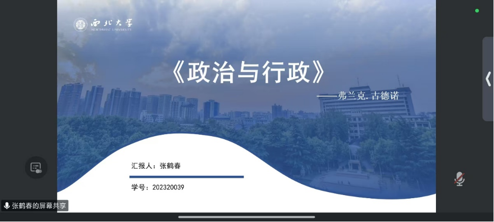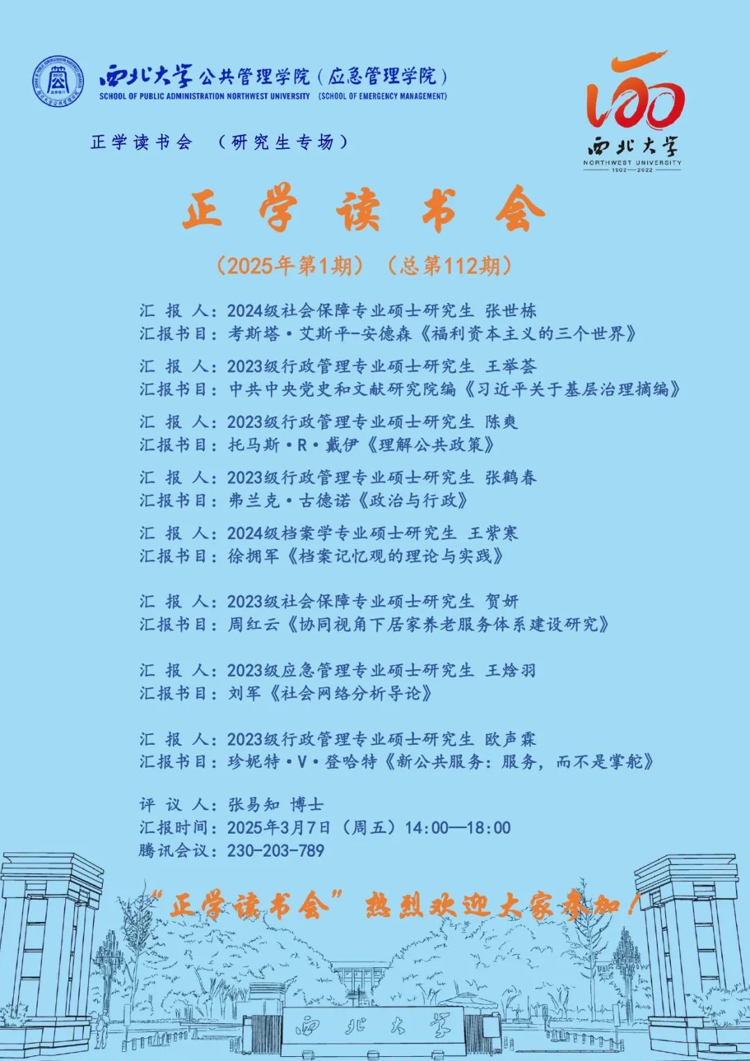 2025年3月7日,我院于腾讯会议线上举办了2025年第1期正学读书会。西北大学565net必赢2024级社会保障专业硕士研究生张世栋、2023级行政管理专业硕士研究生王举荟、2023级行政管理专业硕士研究生陈爽、2023级行政管理专业硕士研究生张鹤春、2024级档案学专业硕士研究生王紫寒、2023级社会保障专业硕士研究生贺妍、2023级应急管理专业硕士研究生王焓羽、2023级行政管理专业硕士研究生欧声霖分别作为主讲人进行读书汇报,565net必赢2024级博士研究生张易知担任评议人,部分研究生旁听了此次报告会。