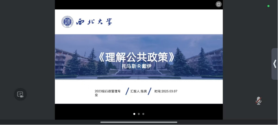 2023级行政管理专业硕士研究生陈爽分享的书籍是托马斯·R·戴伊的《理解公共政策》,她围绕作者简介、著作背景、核心内容与理论反思四大板块展开深度解析。首先,她系统梳理了戴伊的学术成就与著作影响力,本书凭借理论模型与实证分析的有机融合已成为全球公共政策学科的标杆教材,书中提出的八种政策分析模型不仅构建了政策研究的多元视角,更突破了传统政策制定“黑箱”的认知壁垒。在背景剖析环节,她从学科发展与现实需求双重维度展开论述,阐述了戴伊通过制度模式、渐进主义等八大模型。在核心内容解读部分,她阐释政策分析涵盖描述、归因与评估的完整链条,并重点剖析八种政治模式的差异化视角,如从理性主义的公益最大化理想到渐进主义的现实妥协。针对理论局限与现实挑战,陈爽同学展现了批判性思考,她指出戴伊范式存在变量混同、模型重叠等五大逻辑缺陷,并结合人工智能时代背景,她以“经济人”假设为例,分析数据垄断与智能决策对传统理论根基的冲击。