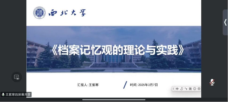 2024级档案学专业硕士研究生王紫寒分享的书籍是徐拥军的《档案记忆观的理论与实践》,她主要从书籍概况、书籍解读、书籍评价和个人感悟四个部分进行分享。首先介绍了本书的作者及书籍概况。其次从“理论”与“实践”双重维度对书籍进行剖析,理论维度系统梳理了档案记忆观的研究进展,深入剖析以后现代主义思潮、后保管时代档案理论、档案范式理论、社会记忆理论为代表的档案记忆观的理论基础,着重阐释了档案记忆观的核心思想内涵:档案是建构社会记忆的不可替代要素、档案工作是建构社会记忆的受控选择机制、档案工作者是建构社会记忆的能动主体、档案记忆促进身份认同。实践维度主要解读了国外记忆工程的特点与经验,总结了我国城市记忆工程和乡村记忆工程的模式、成绩与不足,在此基础上提出了建设“中国记忆”数字资源库的初步构想。再者该同学提出该书能够充实档案学研究成果、深化档案领域服务范围及为记忆工程提供参考,并引发关于档案真实性、档案价值、档案管理理论、档案工作者职业形象的多元思考。最后分享了个人感悟与反思。她提出,在全球化背景下,如何构建具有本土特色的档案记忆体系,是值得深入探讨的问题。