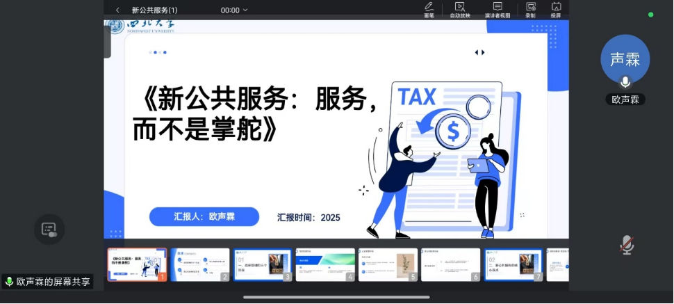 张易知博士对欧声霖同学的汇报内容做出点评。汇报人的核心观点明确、层次分明,既精准提炼了新公共服务理论的核心要义,又通过案例实证展现了理论的现实生命力,对汇报人的思考和感悟表示肯定。