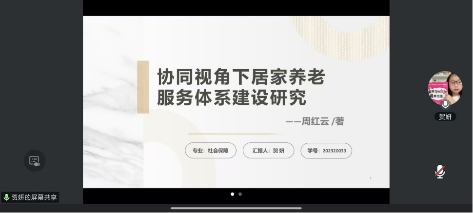 2023级社会保障专业硕士研究生贺妍分享的书籍是周红云的《协同视角下居家养老服务体系建设研究》,她从写作背景、理论基础、逻辑框架、核心内容和读书感悟五个方面进行分享。她首先介绍了本书的写作背景,老年人口数量的不断增加使得养老服务需求呈现剧增的趋势,然而,我国的养老服务体系发展不成熟,供给能力十分有限,如何建设养老服务体系,以应对日益增长的养老服务需求,成为政府和学术界高度关注的重大社会问题。其次她介绍了本书的理论基础:协同理论,并从五个方面展开说明了本书的逻辑框架。随后她详细分享了本书的五点核心内容。最后,她提出了一些自己关于推进居家养老服务建设的一些见解。