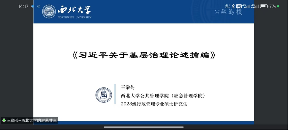 2023级行政管理专业硕士研究生王举荟分享的书籍是中共中央党史和文献研究院编的《习近平关于基层治理摘编》,在汇报中,王举荟紧扣总书记关于基层治理的重要讲话,深入阐释了书中要义。书中指出,基层治理乃是国家发展的基石,“基层强则国家强,基层安则天下安”,深刻揭示了基层治理的重大战略意义。基层治理的核心目标在于服务群众、造福群众,同时要巩固基层政权,完善民主制度,打造党组织引领下共建共治共享的城乡基层治理新格局。谈及基层治理体系建设,王举荟着重分享书中要点,即通过提升社会化、法治化、智能化、专业化水平,构建更具活力与效率的新型基层社会治理体系。新时代“枫桥经验”对于化解基层矛盾、维护社会和谐稳定,有着不可替代的关键作用。