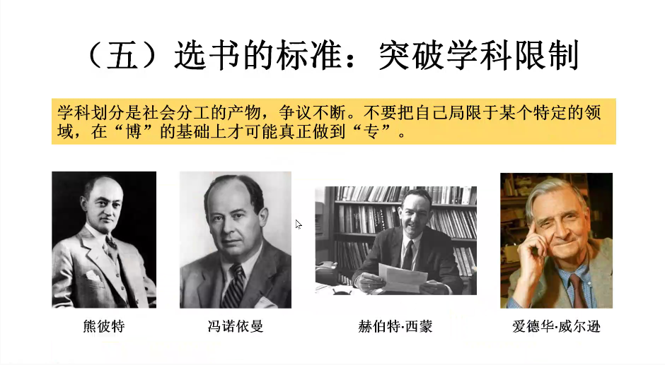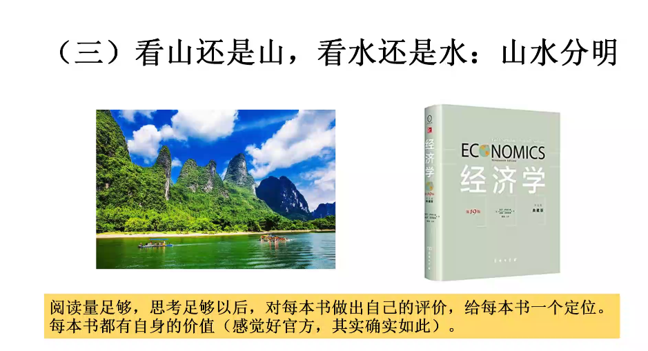 第三部分,周老师分享了关于“读书境界”的认识。根据读书量的由少渐多,对待书的态度也会变化。从对一本书深信不疑的“山清水秀”到理性看待书中知识的“烟雨迷蒙”,再到足以基于知识积累客观评价书籍的“山水分明”,这种变化源于我们知识积累程度不断加深,对书籍知识的态度愈加理性。