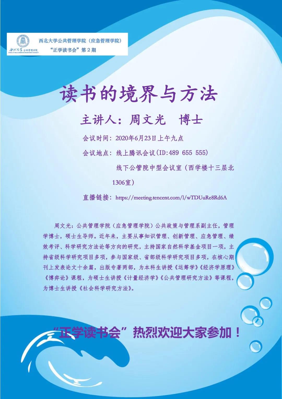 为了进一步营造良好的学术氛围,提高广大研究生的读写思考能力,6月23日上午,我院举办了第二期“正学读书会”。本期主讲人周文光老师围绕“读书的境界与方法”主题展开分享与讨论。本次读书会采用线上线下结合的形式,由学院科研副院长翟绍果教授主持,多名教师和学生参加了本次会议。