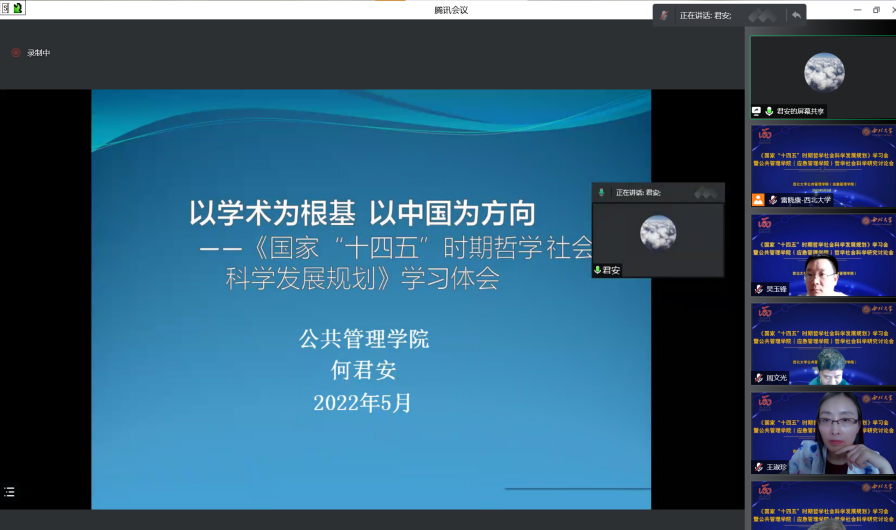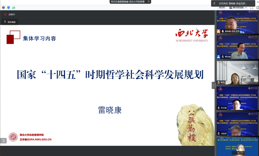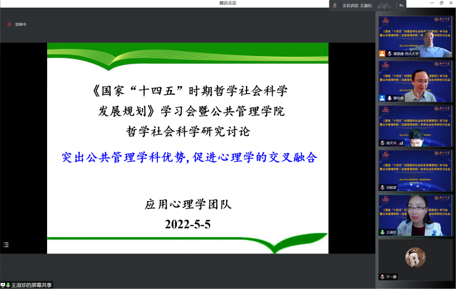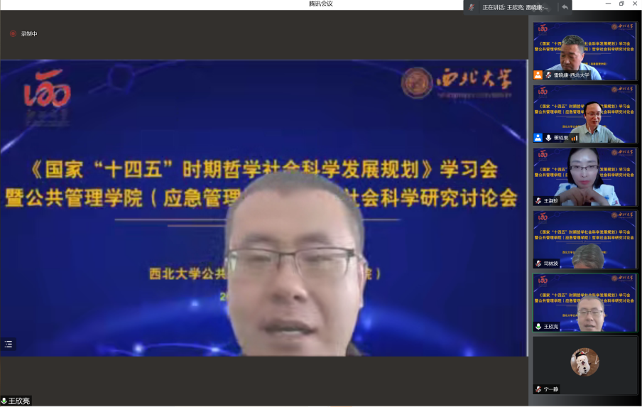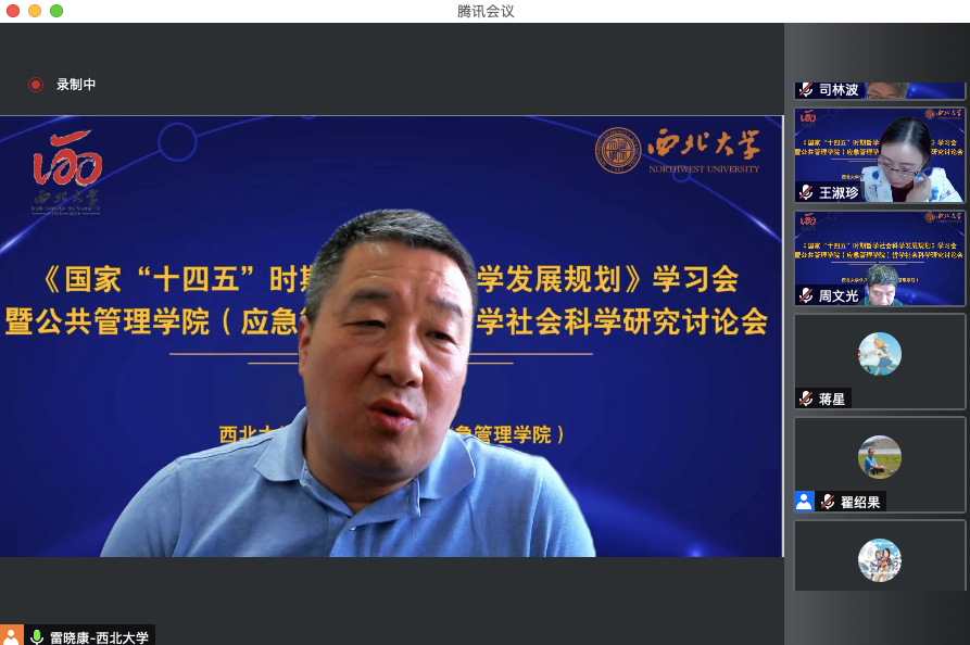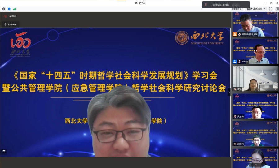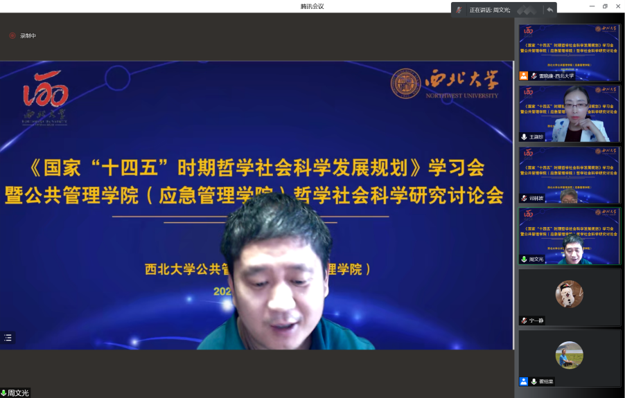 2022年5月5日下午,西北大学565net必赢(应急管理学院)线上顺利召开了《国家“十四五”时期哲学社会科学发展规划》学习会暨565net必赢(应急管理学院)哲学社会科学研究讨论会。会议以‘学术“公馆”,共建共享’为主题,通过对中共中央印发的《国家“十四五”时期哲学社会科学发展规划》的全面深入学习,着力发挥我院公共管理学科、图书情报学科、应用心理学学科等学科交叉优势,努力构建共生共识共建共享的“学术公馆”。本次会议由学院副院长翟绍果教授主持,学校校领导、社科处和学科处领导以及学院全体教师出席了会议。