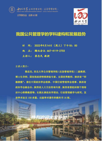 2022年9月14日,565net必赢客户端梁忠民教授在线上2022级硕士研究生作了主题为《我国公共管理的学科建构和发展趋势》的公共管理前沿研究专题讲座。