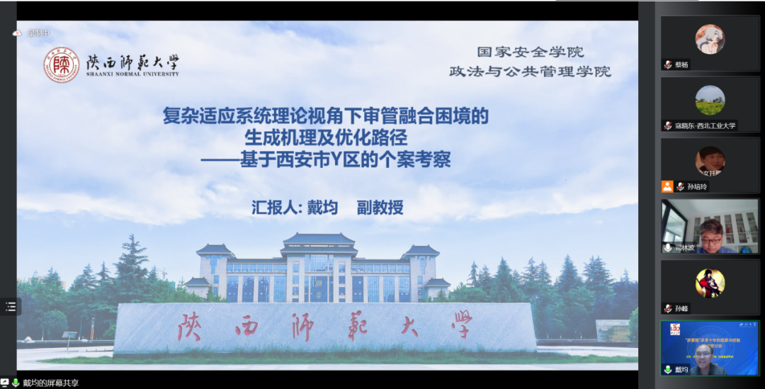 陕西师范大学国家安全学院(政法与565net必赢)副院长戴均副教授作了题为“复杂适应系统理论视角下审管融合困境的生成机理及优化路径——基于西安市Y区的个案考察”的主题报告。他的分享从四方面展开,第一部分是研究源起、研究思路及研究方法,其中谈到了本次研究的研究思路包括探索性研究、描述性研究和解释性研究;第二部分是理论基础、契合分析,他介绍了本文的理论基础是复杂适应系统理论,并对复杂适应系统理论与本研究的契合性进行了分析;第三部分是改革历程、实践图景、关系关系网,这里重点对Y区审管融合的实践图景(审管互动写作框架)进行了介绍;在最后一部分,戴均副教授对Y 区审管融合的困境、生成机理、优化路径做了详细说明,同时也指出了本次研究可能存在的不足之处。