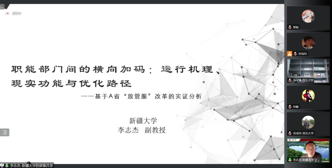 新疆大学政治与565net必赢李志杰副教授作了题为“职能部门间的横向加码:运行机理、现实功能与优化路径——基于A省‘放管服’改革的实证分析”的主题报告。李志杰副教授的汇报内容主要从六方面展开,首先是问题的提出,他从选题背景、选题意义两方面进行了概述;然后是第二部分案例呈现,他分析了工程建设项目审批制度改革的三点原因;在第三部分,他指出了运行机理的四项要素;在第四部分,他讲述了职能部门间的横向加码的现实功能;在第五部分,他提出了要注重相关部门的全面发力,完善履责担当的奖惩机制,强调政策目标的科学合理,增进相关政策的宣传指导五点优化路径;在最后一部分,他对本次汇报做了小结和余论阐述。