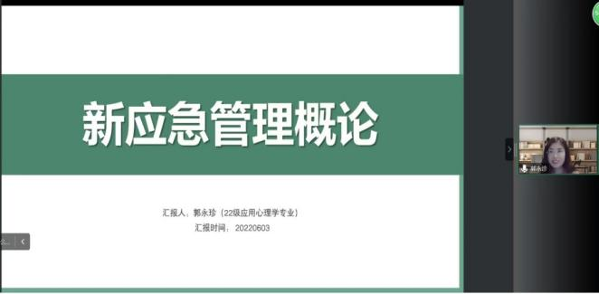 2022级应用心理学专业硕士研究生郭永珍分享的书目为《新应急管理概论》。首先,她简单介绍了该书的地位,本书是应急管理部成立以来国内第一本全面介绍应急管理体制机制和应急安全的重要书籍。其次,她详细地介绍了书中提到的新时代应急管理的基本理论知识以及“大应急”管理理念,相较于以往应急管理,这种理念体现在三个方面。第一方面,在范围上,包括安全生产、防灾减灾救灾、抢险救援等各项应急管理工作。第二方面,在管理流程上,包括突发事件前的准备工作、突发事件发生后的应急响应工作以及社会支持、恢复和重建工作。第三方面,在内容上,也更加全面。最后,她阐释了书中提到的应急救援技能与知识,详细阐述了在突发事件发生之后,展开救援所需的应急救援技能与知识,通过理论与实践的结合,力求更好应对突发事件和做好应急管理工作。