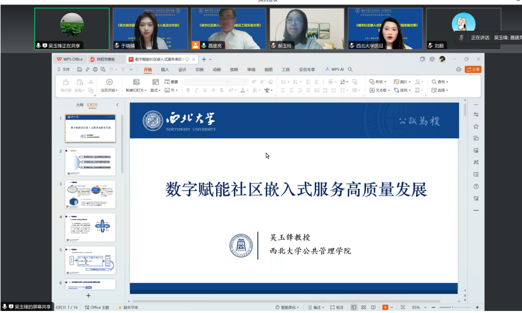 第二阶段是学习体会交流环节。基地专家吴玉锋教授作了题为《数字赋能社区嵌入式公共服务高质量发展研究》的发言。吴玉锋教授从数字赋能社区嵌入式服务高质量发展的问题提出、理论逻辑及其实现路径三个部分进行了汇报,指出要坚持以党建引领、人民为本、安全可控等方式推进数字赋能社区嵌入式公共服务高质量发展。