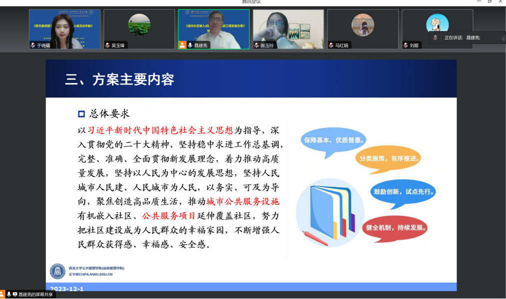 2023年12月1日,民政部政策理论研究基地合作单位在线举办了《城市社区嵌入式服务设施建设工程实施方案》学习交流会。会议由基地常务副主任聂建亮教授主持,基地专家吴玉锋教授、郝玉玲副教授、厉旦博士以及基地相关学者及博硕士生等三十余人参加了会议。