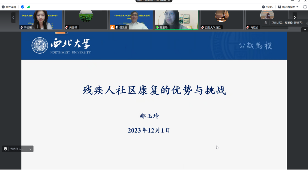 基地专家郝玉玲副教授作了题为《残疾人社区康复的优势和挑战》的发言。郝玉玲副教授回答了为何要提出残疾人社区康复,什么是残疾人社区康复,残疾人社区康复如何发挥作用,残疾人社区康复的成效如何等四个问题。并从国际视角对残疾人社区康复的优势与挑战进行了归纳,清晰地呈现了残疾人社区康复发展的现状。