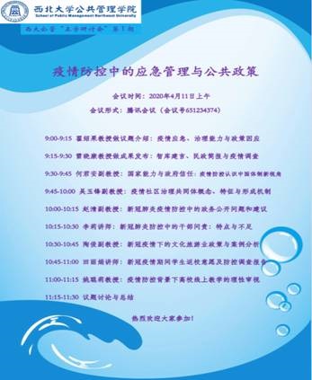当前,新冠肺炎疫情在全球蔓延,超过200个国家和地区确诊病例已逾170万例。在此背景下,2020年4月11日,西北大学565net必赢举办了“疫情防控中的应急管理与公共政策”线上学术学术研讨会。本次会议从“疫情应急、治理能力与政策因应”、“智库建言、民政简报与疫情调查”、“国家能力与政府信任”等主题展开了分享与讨论。学院院长雷晓康教授、学院书记孙录见副教授、姚聪莉教授、许琳教授、李尧远教授、司林波教授等校内外100多名老师和学生参加了本次会议。本次研讨会由学院科研副院长翟绍果教授主持。