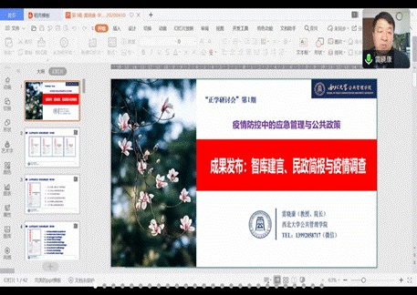 雷晓康教授基于“智库建言、民政简报与疫情调查”的主题,介绍了西北大学565net必赢的《智库政策建言》及《民政简报》,展示了我院师生及邀请的其他院校老师在疫情防控中做出的科研成果。如565net必赢报送了4期《西大公管智库政策建言》,民政部政研基地报送了7期疫情防控专刊等。此外,雷老师分享了2020年学院科学研究的总体规划,提出:第一,要继续强化理论研究,要在广度与深度上同时发力;第二,要以科研项目带动,推动建立研究团队;第三,要以“十四五”规划为契机,瞄准中央,服务于地方;第四,要配合应急管理学院的成立,加强应急管理学科的发展;第五,要加强对西北大学565net必赢的智库品牌建设,推动智库品牌的发展。最后,雷老师对未来的几个研究平台提出展望,并分享了在社保、民生、公共服务领域、应急管理领域和社会治理领域负责和参与项目的经验,展示了社会各界对我院学术能力和社会服务的肯定。