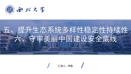 紧接着,李爽同学分享汇报了《意见》第五节“提升生态系统多样性稳定性持续性”和第六节“守牢美丽中国建设安全底线”两部分内容。一方面,建设美丽中国是全面建设社会主义现代化国家的重要目标,要锚定2035年美丽中国目标基本实现,提升生态系统多样性、稳定性、持续性,筑牢自然生态屏障,实施山水林田湖草沙一体化保护和系统治理,加强生物多样性保护。另一方面,守牢美丽中国建设安全底线,必须符合我国资源环境承载能力,健全国家生态安全体系,确保核与辐射安全,加强生物安全管理,有效应对气候变化不利影响和风险,严密防控环境风险。
