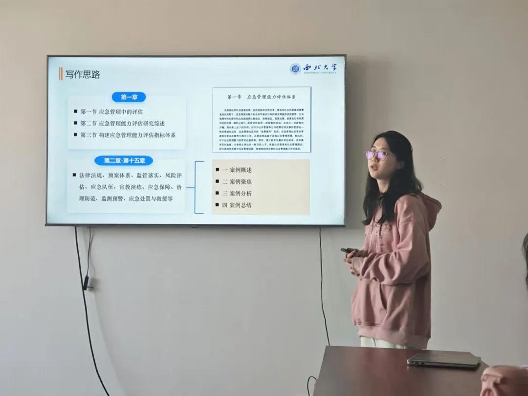 2023级应急管理专业硕士研究生沈冰洁分享的书目是滕五晓教授编著的《应急管理能力评估:基于案例分析的研究》,她从书籍简介、逻辑框架、内容梳理和启示思考四个部分展开汇报。首先,她指出本书既具备了应急管理能力评估的专业知识,又具备代表性与典型性的案例特色,呈现出评估指标与案例研究相结合的理论透视和学术透析。其次,她总结到该书在框架结构上基于构建的14项一级指标为章节内容,各章内容之间既相互独立又有案例关联。随后,她节选了书籍中具有代表性的章节,以“典型案例+评估指标”的方式探讨了选择该指标作为评估标准的依据。最后,她围绕“应急管理能力评估的目的和意义?”和“应急管理能力评估面临的现实挑战?”问题,指出开展评估工作是提升各地区、各领域应急管理能力的重要发力方向。