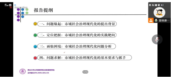 20221019日,西北大学565net必赢雷晓康教授通过腾讯会议为全体研究生作了题为市域社会治理现代化问题研究”的线上专题讲座。