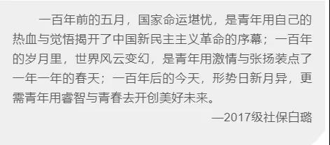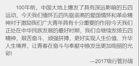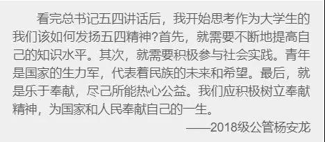 陈露老师说,习近平总书记的讲稿分两部分,一部分是站在时代的高度来定性五四运动,另一方面是对青年人提出鼓励与希望。进入新时代,我们要把握住五四运动所包含的深厚历史与现实内涵,习近平总书记对五四运动的定性,既是对历史承诺的担当,也是对实现社会与人生的叩访,更是对未来历史的关照。