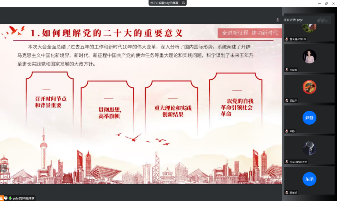 研究生公共行政学系第一党支部于2022年11月18日至21日通过线上线下相结合的方式,开展了以“学深悟透二十大,砥砺奋进新征程”为主题的系列活动。本次主题党日活动由支部书记韩晓丽同志、组织委员毛娅同志主持,支部全体党员、入党积极分子四十余人参加。
