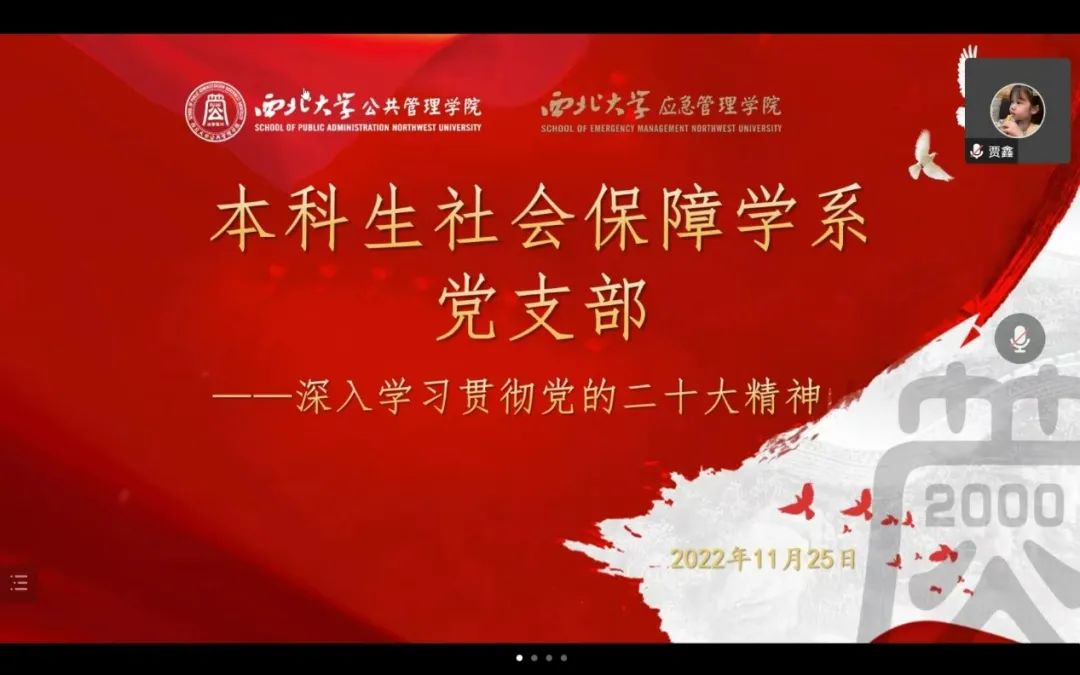 2022年11月25日,565net必赢研究生社会保障学系党支部以线上形式开展”学习党的二十大“主题党日活动,支部书记彭丹阳同志主持,全体党员同志、入党积极分子参加。
