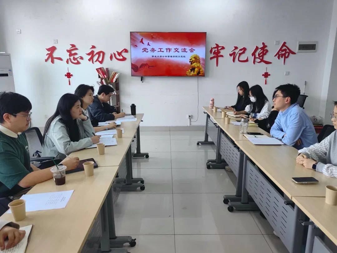文化遗产学院张梓彤老师介绍了文化遗产学院党务工作模式由各支部“单打独斗”向党务工作站“握指成拳”凝聚力量探索发展的过程,并就如何平衡党务工作站与各支部、党务工作学生干部与支部委员班子的关系,如何充分发挥学生党员、入党积极分子先锋模范的作用,如何优化各类考核与激励制度等问题与我院分党校工作人员进行探讨。激流讨论,智慧交锋,在交流的过程中,两院的党务工作人员们发现,进一步提升党员的党性修养、提高党员在党务工作中的积极性是当务之急。