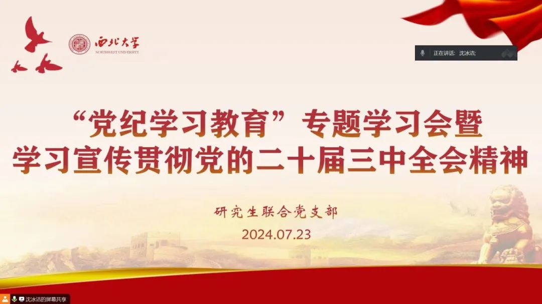 为深入贯彻全面从严治党的工作要求,进一步深入开展党纪学习教育,推进纪律教育常态化,营造学纪、知纪、明纪、守纪的浓厚氛围,我院研究生联合党支部于7月23日在线上开展“党纪学习教育”专题学习会暨学习宣传贯彻党的二十届三中全会精神。大会由研究生联合党支部书记沈冰洁同志主持。
