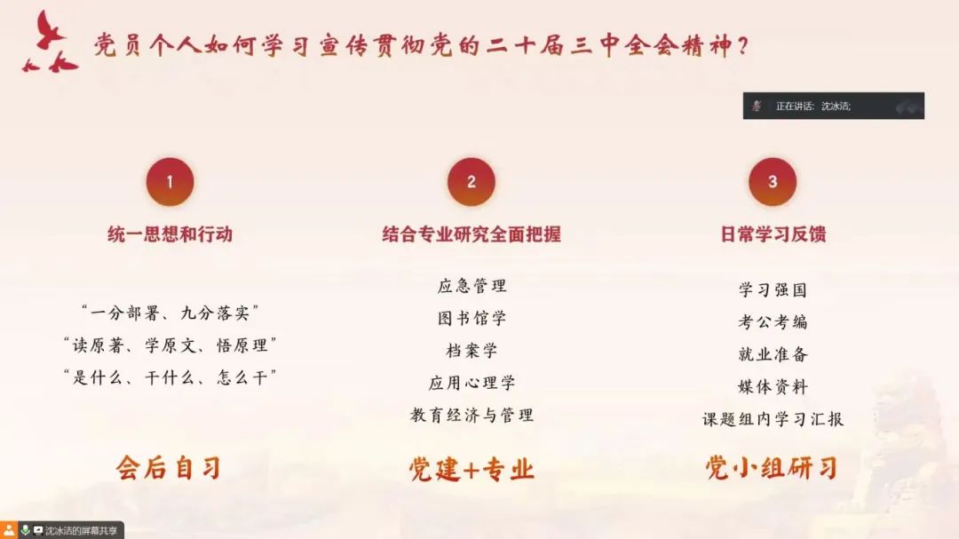 会议最后,支部书记沈冰洁同志为实现党建与专业互促互进,传承与创新并行驱动的良好效果,结合研究生联合党支部“党建+专业”的建设模式,围绕“党员个人如何学习宣传贯彻党的二十届三中全会精神?”这一问题明确了支部党员个人的学习要求,党小组内部研讨学习计划以及下学期支部党建工作的开展方向。