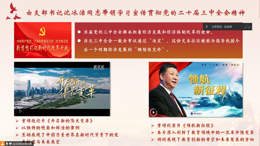 研究生联合党支部书记沈冰洁同志带领支部党员学习宣传贯彻党的二十届三中全会精神,组织支部党员学习了《中国共产党第二十届中央委员会第三次全体会议公报》核心内容,并就支部党员学习宣传贯彻党的二十届三中全会精神提出要求。沈冰洁同志特别强调全会提出的“以钉子精神抓好改革落实”,这一重要指示不仅是对国家层面改革工作的深刻要求,更是我们每一位研究生党员在科研与生活中的重要指引。作为研究生党员,我们要在科研与生活中发扬钉子精神,以更加饱满的热情、更加坚定的信念、更加扎实的作风投入到学习和工作中去。此外,全会还强调要“深化党纪学习教育”,这一强调不仅与全面从严治党的战略布局紧密相连,也与我们本次会议的主题形成呼应,凸显了党纪学习教育在加强党的建设、提升党员素质方面的重要性。