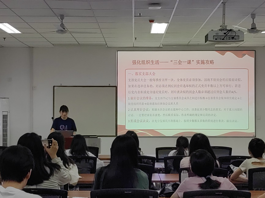 会议第四项议程,由分党校宣传部负责人郑雨露做党务知识培训。郑雨露同志以《强化组织生活——“三会一课”实施攻略》为主题,围绕“落实支部大会、落实党委会、开展党小组会、坚持党课制度、制度联系实际”五个维度展开详细讲解。她提到,组织好“三会一课”是基本的常识问题,是基层党组织负责人应该具备的基本功。联系好实际,还必须不断学习总结、创新方式方法,抓住当前需要解决的主要问题和工作重点,把握人员的思想动态,将“三会一课”有效地与本单位中心工作的开展有机地结合起来,相互渗透、相互促进,才能起到良好的效果。