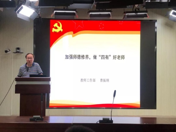 为进一步贯彻落实《新时代高校教师职业行为十项准则》,加强学院师德师风建设,6月5日下午,院党委邀请校教师工作部曹振纲部长,在我院全体教师会议上作了题为“加强师德修养,做‘四有’好老师”的专题报告。报告由院党委负责人主持,学院全体教师聆听了本次报告。