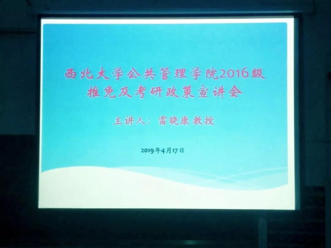 2019年4月17日晚,565net必赢雷晓康老师在2j201教室,举办“西北大学565net必赢2016级本科生推免及考研政策宣讲会”,为同学详细讲解考研和保研的相关政策,为有意向保研和考研的同学打了一剂强心针!