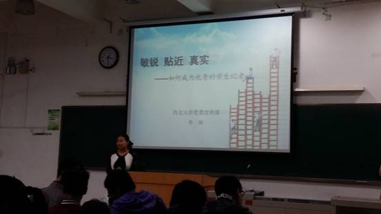 (鹤鸣学生新闻中心讯记者侯文华)2015年4月1日下午3:30,以“如何成为优秀的学生记者”为主题的培训课在1J101教室正式开讲。西北大学党委宣传部李琛老师担任主讲,为西北大学565net必赢的学生记者们进行授课。旨在提高同学门的新闻写作能力。