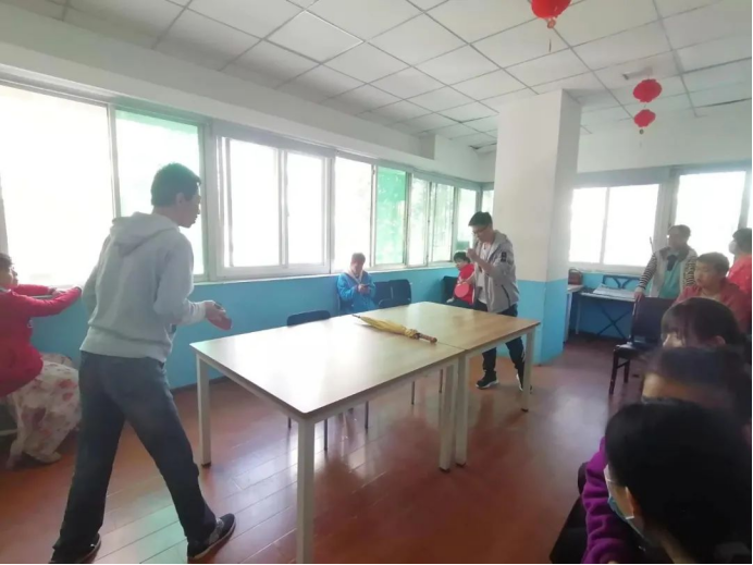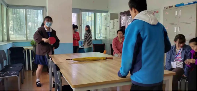 两两对打,每个人轮流着打四个球,其他人便坐在旁边的椅子上观看。打乒乓球的过程中,大家的欢笑声连续不断,响彻了整个屋子。通过打乒乓球,大家不仅得到了锻炼,而且在欢笑声中增进了朝阳青年志愿者与慧灵残障人士的友谊。