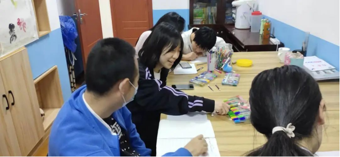 他们用小小的画笔静静地描绘,仿佛要将整个内心铺满画纸。在绘画过程中大家充分交流绘画内容与方法,互相帮助一同完成画作。我们以共同学习绘画这一轻松愉悦的方式,不仅帮助了他们通过绘画表达他们的内心世界,让他们打开心窗,与志愿者们友好交流,更密切了彼此的友谊,成为更加默契的朋友。