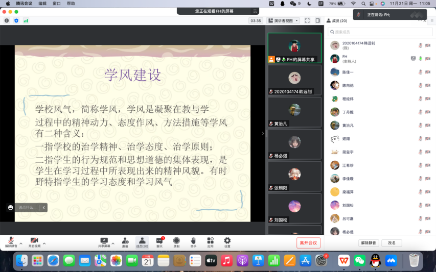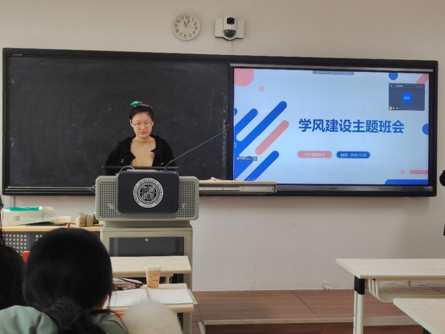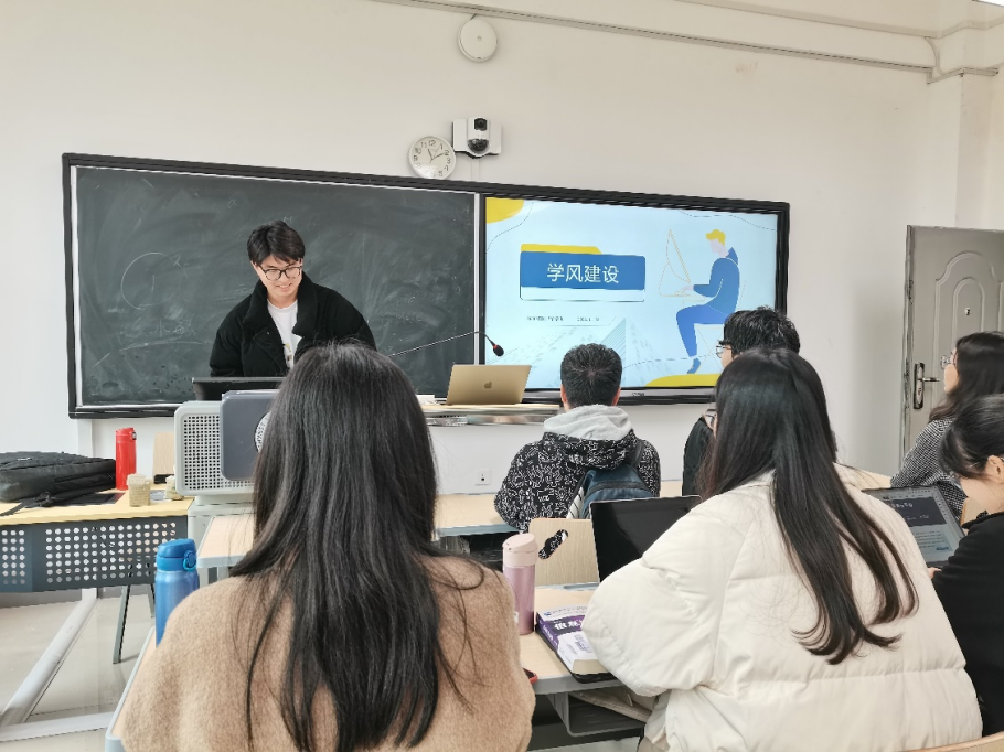 会议由班长杨泽曦同学组织召开。首先,他就“学风建设”展开介绍,向同学们讲述了学风建设的重要性,指出“学风建设对人的影响是潜移默化的,良好的学风建设能促进我们实现自我完善,同时,学风建设也是一个学校营造良好氛围的关键。”通过PPT展示、视频分享,同学们认识到学校加强优良学风建设的初衷所在。