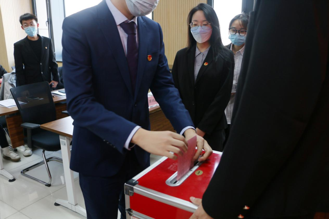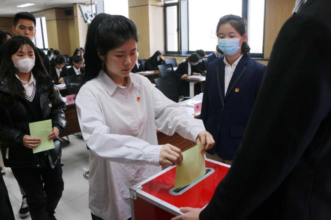 各位学生代表积极参与并认真对待选举投票,依次将写好的选票放入投票箱中,在计票人员统计选票后,由总计票人于骐东宣布大会选举结果。