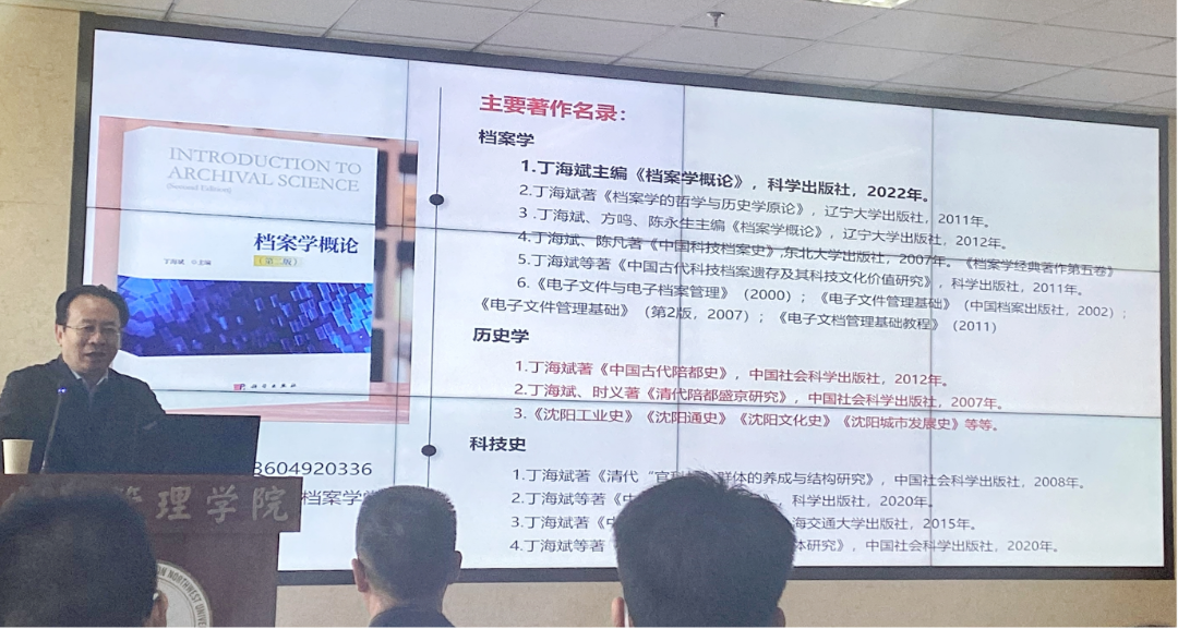 黄新荣教授首先为与会人员介绍了本次报告会的报告人——丁海斌教授。丁海斌,广西民族大学管理学院二级教授,全国档案领军人才、国家级档案专家领军人才、中国档案学会副监事长,数字档案管理与档案服务业研究中心主任,担任《档案学通讯》、人大复印资料《档案学》《档案管理》《档案与建设》《档案》《山西档案》等多家杂志的编委、审稿专家、栏目主持人。长期从事档案学、中国古代史、中国科技史历史语言学等领域的研究,发表学术文章300余篇,出版学术著作30余部。
