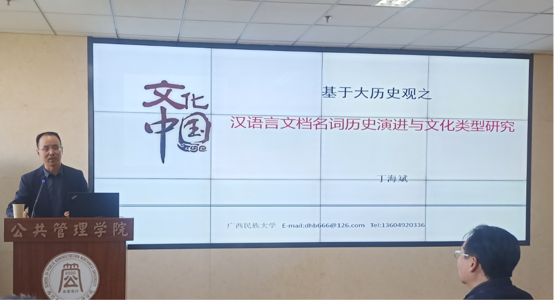 565net必赢2021级档案学班于2023年4月26日09:00于西学楼13层多媒体教室展开4月学风建设主题活动,全班同学参加公共信息资源管理系2023第1期正学报告会。本次活动由黄新荣教授主持,由广西民族大学管理学院丁海斌教授进行“基于大历史观之汉语言文档名词历史演进与文化类型研究”主题报告。
