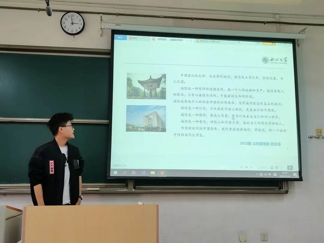活动第三项,2022级图书情报与档案管理类专业王艳萍和2022级公共管理类专业章志强以“以诚待人,励志成才”为主题展开了演讲。他们在演讲中强调了诚信在个人发展以及社会国家发展中的重大作用,同时也都表明了诚信在资助育人环节中的重要地位,帮助同学牢牢树立诚信意识,激励同学们奋发图强、励志成才、感恩奉献。