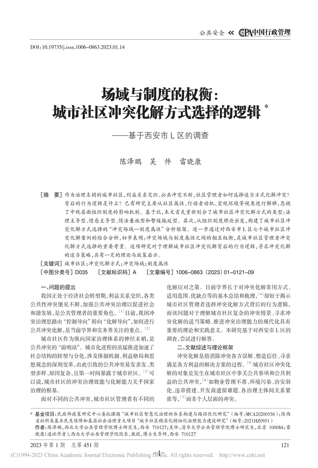 《场域与制度的权衡:城市社区冲突化解方式选择的逻辑》一文是在雷晓康教授的指导下,由我院博士研究生陈泽鹏与清华大学博士研究生吴件合作完成,文章发表在权威期刊《中国行政管理》2023年第1期。该文聚焦城市社区冲突化解方式选择背后的逻辑,首先重新划分了城市社区冲突化解方式的类型:法理主导型、情感主导型、情法兼施型和暂缓拖延型。其次,从组织制度理论出发,构建了城市社区冲突化解方式选择的“冲突场域—制度属性”分析框架。进一步通过对西安市L区七个城市社区冲突化解案例的综合分析,初步表明:冲突场域与制度属性之间的相互权衡,是城市社区管理者冲突化解方式选择的重要考量。这项研究对于理解城市社区冲突化解背后的行为逻辑,寻求冲突化解的适当策略,具有一定的理论与政策启示。